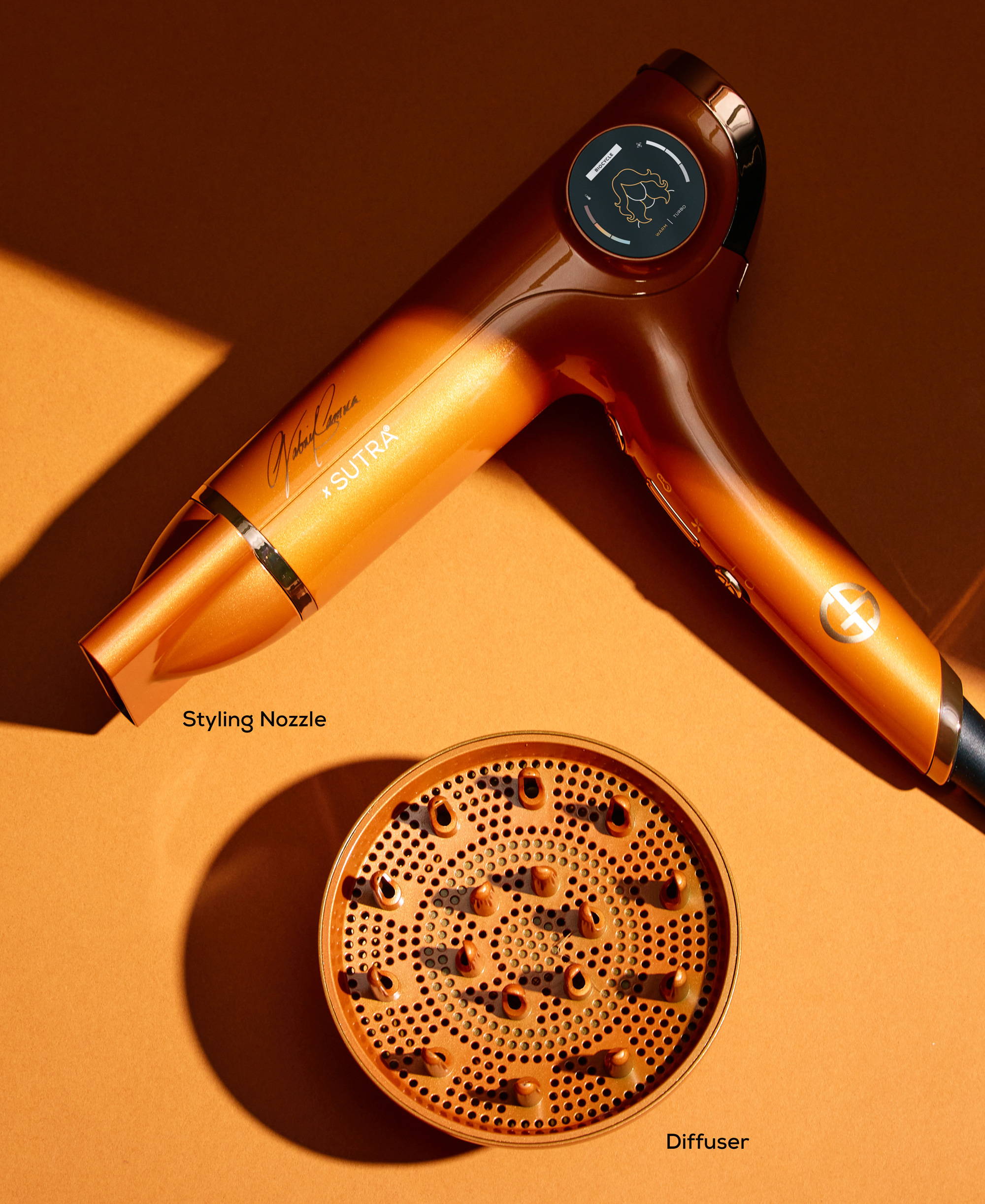 The Samra Dryer uses SUTRA®’s Healthy Heat™ technology powered by Biocycle Technology, using advanced thermal sensors and smart temperature monitoring to prevent excessive heat exposure. This intelligent system protects against damage, seals in color, and supports long-term hair health.