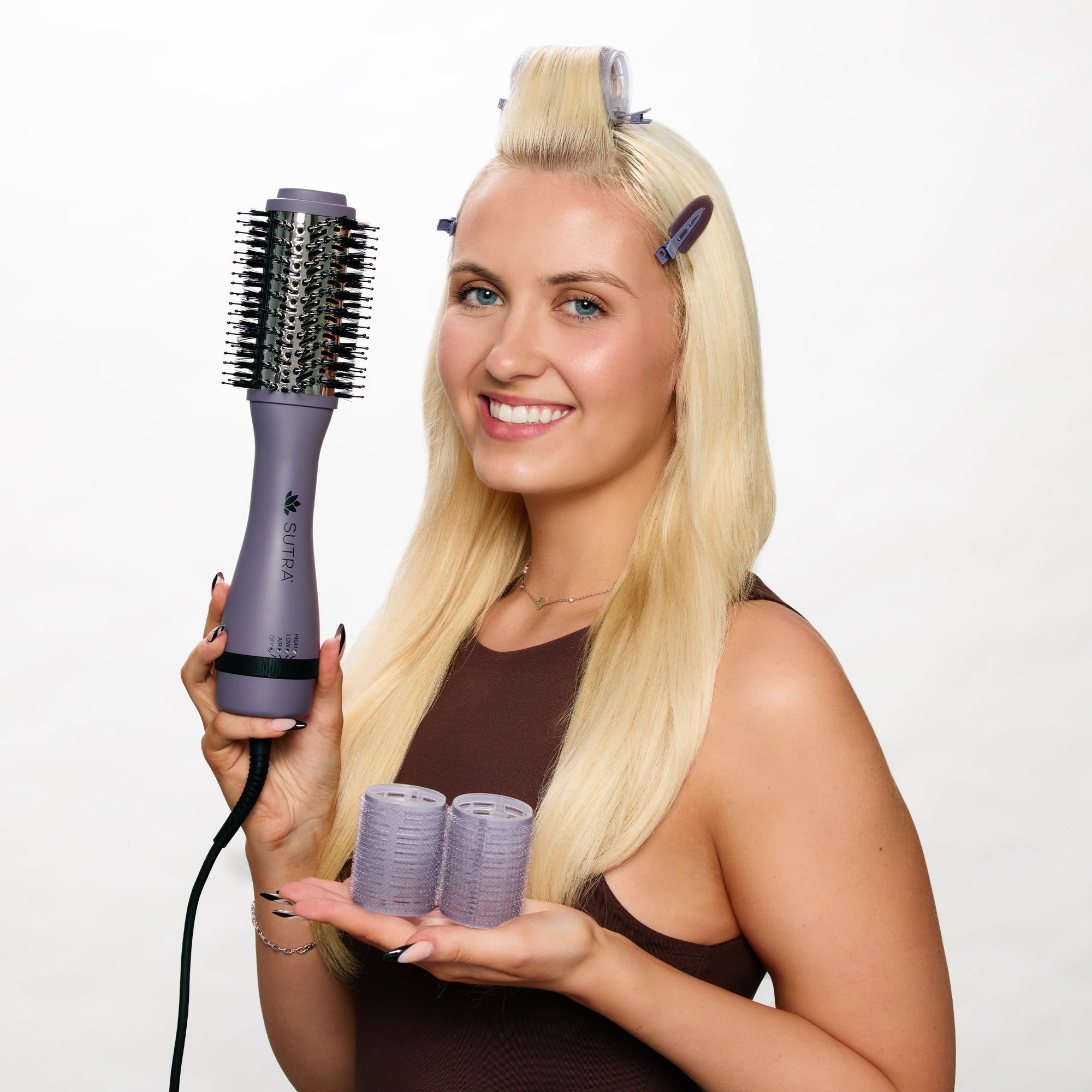 All your blowout essentials in one complete styling kit. The SUTRA Bombshell Set includes our signature Blowout Brush plus a full set of 6 rollers and 6 professional hair clips for effortless sectioning and long-lasting volume.